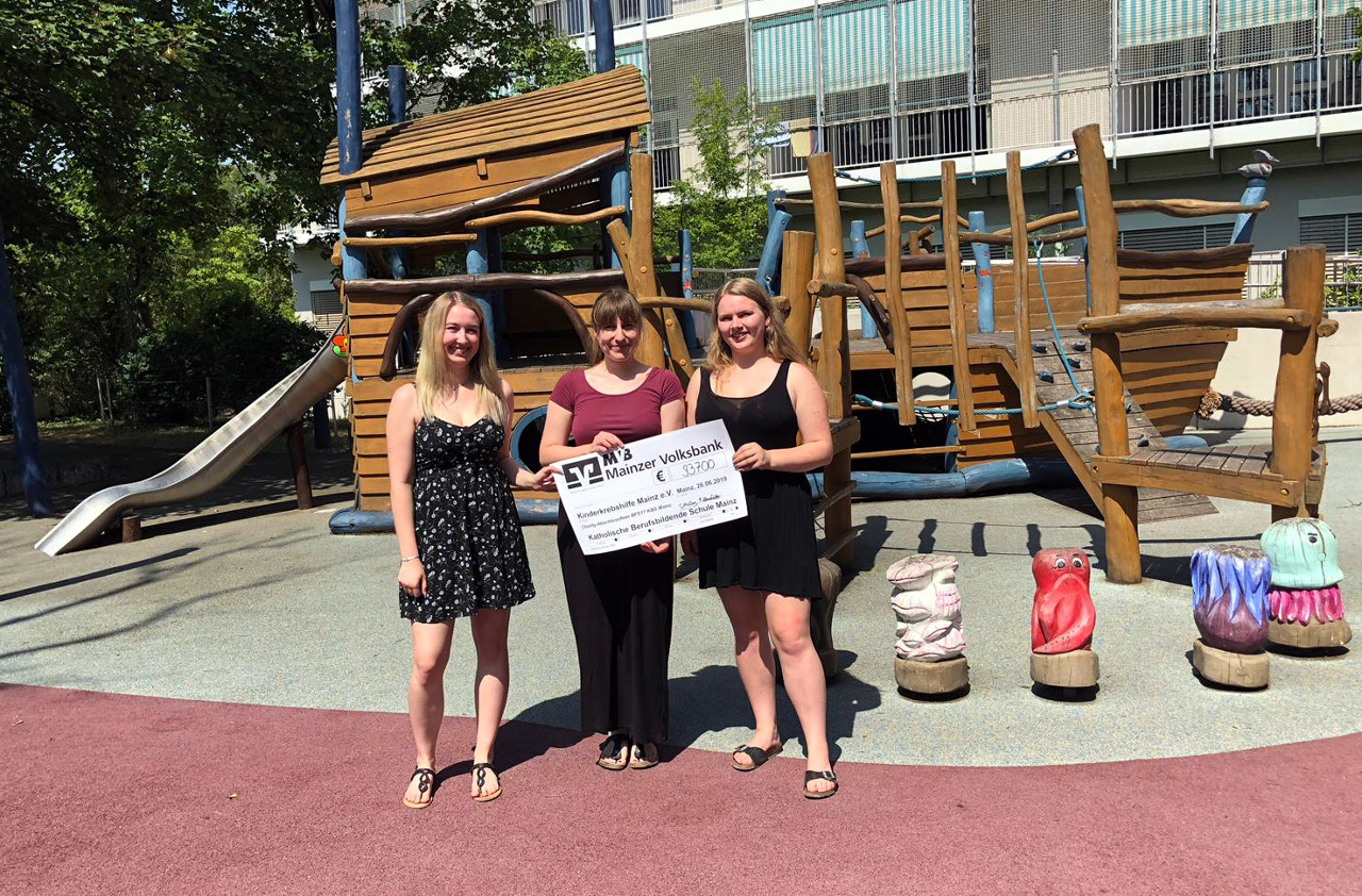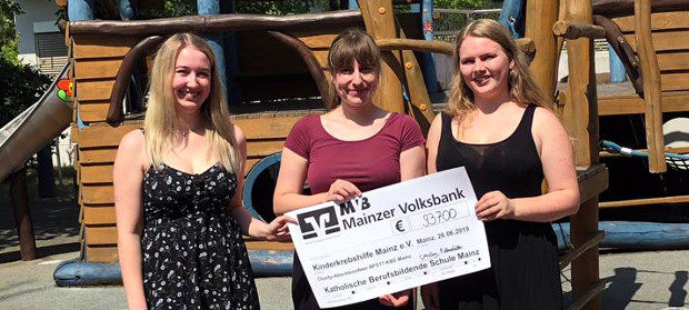 Eine Spendensumme von 937 Euro – damit hatten Sara Umstätter und Celine McCoy gar nicht gerechnet, als sie die Idee hatten, bei der diesjährigen Abschlussfeier Spenden für die Kinderkrebshilfe zu sammeln. Eine Tombola hatte neben Spenden von Gästen während der Abschlussfeier für eine ordentlich klingelnde Kasse gesorgt. „Mit der Spendenaktion wollten wir auch den Menschen etwas zurückgeben, die Hilfe benötigen. Wir sind froh, dass wir durch unsere Spende die Kinderkrebshilfe Mainz e. V. unterstützen konnten.“ Das Bild zeigt die Initatorinnen bei der Übergabe des Schecks an eine hocherfreute Laura Faber, Mitarbeiterin der Kinderkrebshilfe Mainz e.V.
