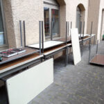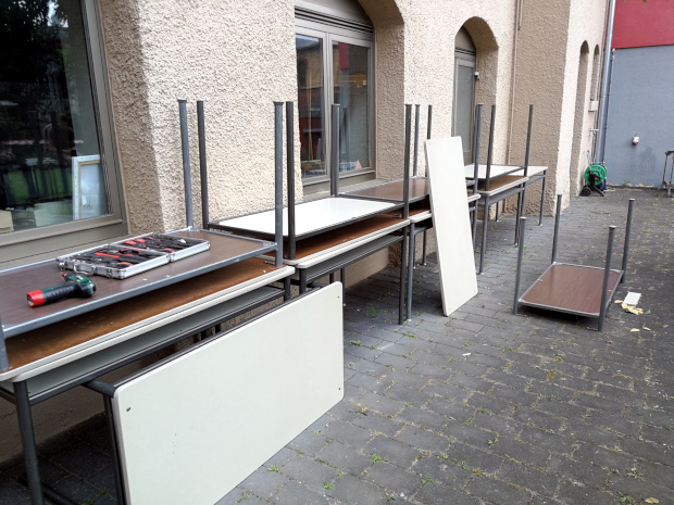 … sind eingetroffen. Damit diese ihre neuen Räume beziehen können wird augemistet.Das kommt vielen Schülerinnen und Schülern gerade recht. Jetzt, wo die Noten eingetütet sind, engagieren sie sich tatkräftig in der Umrüstung von Räumen und Einrichtung am Schulstandort in der Mainzer Innenstadt. Bei dieser Gelegenheit kommen auch zahlreiche antiquarisch anmutenden Schätze aus Lagerräumen zum Vorschein. Sauber gestapelt warten sie auf eine Verwendung in Initiativen und Vereinen oder eben auf ihre Verwertung.